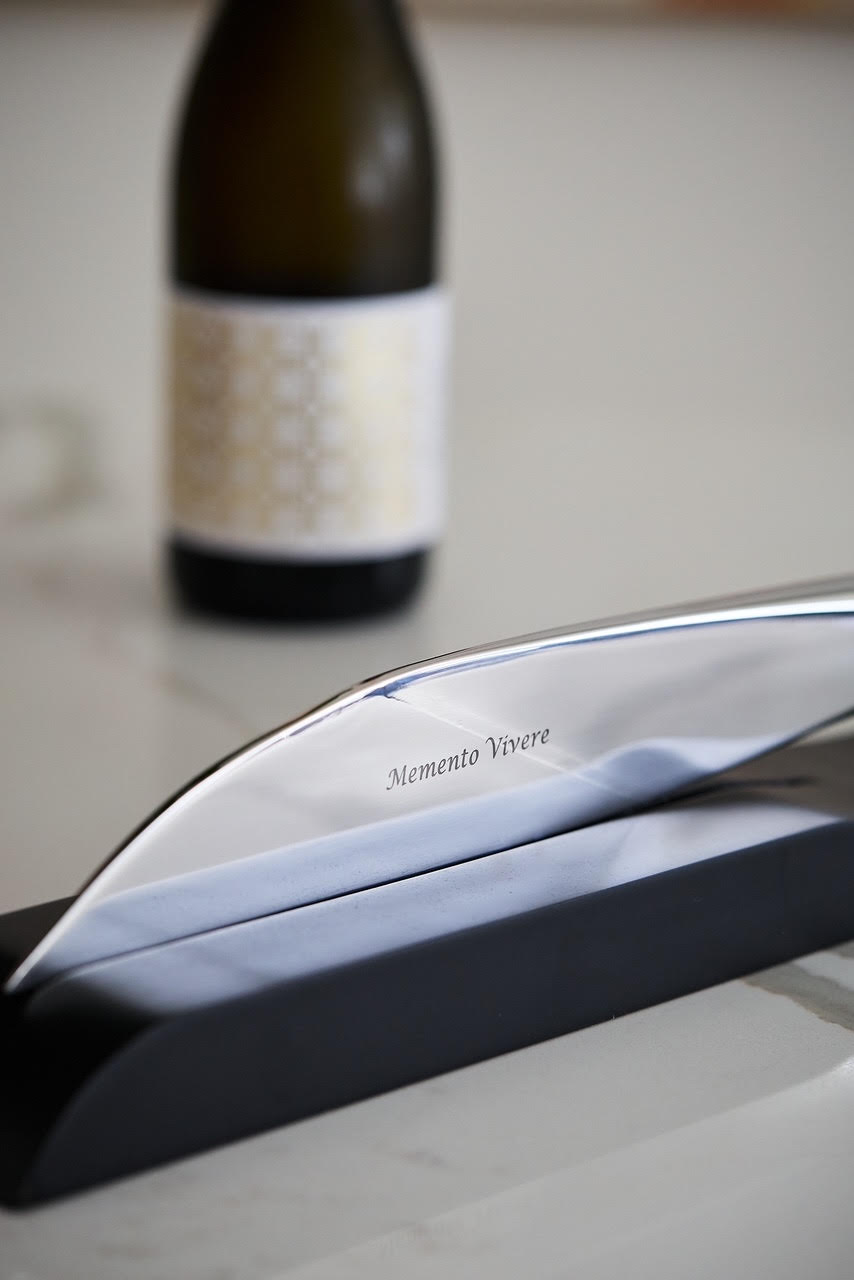 The SPLENDOUR Champagne Sabre features a sleek, modern design that blends contemporary aesthetics with the timeless tradition of sabrage. Its flowing lines and elegant curves make it a stunning centrepiece for any celebration.